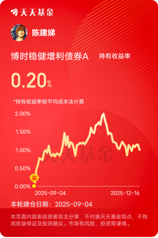 我的投资经验是,市场看不清方向时,风险控制是第一位的。$博时稳健增利债券A$ 通过优质的债券资产打底,并适度参与权益市场,在控制回撤的同时争取不错的收益,一年下来涨了7%以上。近期两大政策利好直接加持这只基金,一是城投债融资回暖,12月以来城投债净融入27亿元,四川、广东等省份发行火爆,3倍以上认购的债券占比达55%。这基配置了不少中短期限的高等级城投债,3年左右的品种正好是市场追捧的热点,这类债券收益率近期下行1-4bp,信用利差收窄,收益很稳定。二是政治局会议强调“积极的财政政策+适度宽松的货币政策”,中长端债券收益率快速下行,它持有的10年期以内信用债都能受益。这基权益仓的周期和消费板块也很会踩点!重仓的中国太保是高股息龙头,在利率下行周期里估值持续提升;中国石油化工股份、洛阳钼业跟着大宗商品价格回暖,近期都有不错涨幅。尤其是洛阳钼业,受益于新能源上游资源需求增加,12月单股涨幅超5%。债券仓靠城投债、二永债稳稳拿利息,权益仓抓周期、消费的结构性机会,现在A股3800点附近正是布局好时机,加上搜“博时固收”就能领20元券,申购成本更低,入手划算。#挖掘超额收益# #晒收益#