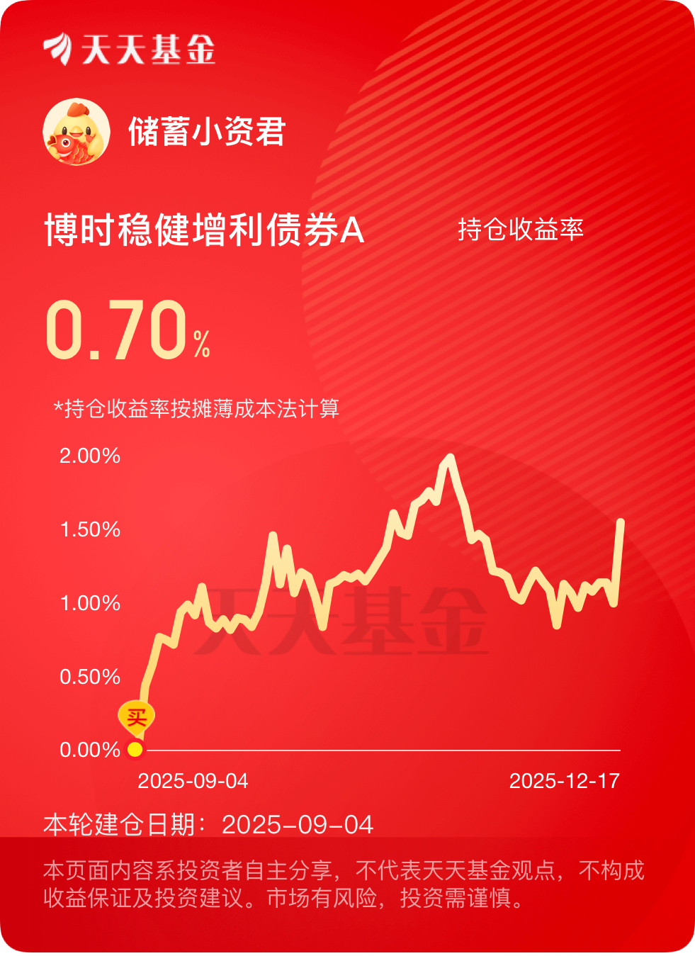 市场暖风一吹,$博时稳健增利债券A$ 猛猛收蛋,一天狂收50多!六个月下来累计囤蛋将近500个,产蛋稳又多。当下信用环境持续优化,中国银行间市场交易商协会近期对10家企业的债务融资工具注册额度进行核减,合计达192.93亿元,通过清理不合规额度,减少了信用债市场的潜在风险,让优质信用债的吸引力进一步提升。这只基的债券持仓中,高等级信用债占比不低,在信用环境优化的背景下,信用利差持续收窄,既保证了收益稳定性,又降低了违约风险。加上中央财办明确明年继续实施更加积极的财政政策,保持必要的财政赤字和债务总规模,为债市提供了长期政策支撑,让基金的债券底仓更具安全性和收益确定性。再看权益方面,精准把握了扩大内需的政策导向,布局了消费和福建板块这两大热门领域。消费板块作为明年头号任务,国家发改委推出提振消费专项行动,首发经济、银发经济、冰雪经济多点开花,基金持仓的大商股份、奥佳华等个股,分别受益于首发经济热潮和银发经济需求增长,随着消费贷贴息扩容、养老金上调,后续增长潜力十足。现在搜索“博时固收”就能拿到20块优惠券,相当于又多了一笔额外收益。##消费板块利好不断!投资机会如何寻找?#