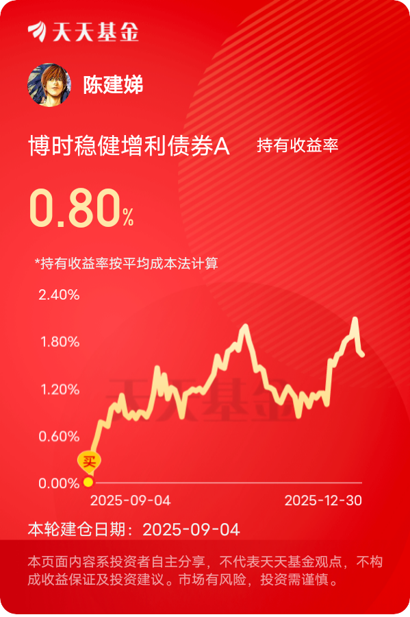 眼下行情,低波固收+拿着心态更从容,$博时稳健增利债券A$ 债券作主菜管饱,股票当配菜提鲜。跌起来有缓冲,长期收益还挺惊喜,一年时间,770多个蛋轻松入手,美滋滋。12月央行货币政策委员会第四季度例会的定调。12月18日的例会明确要继续实施适度宽松的货币政策,加大逆周期调节力度,还特别提到要关注长债收益率变化,保持流动性充裕。这基债券仓位占比超过80%,重点配置中高等级信用债和利率债,基金经理擅长把握利率趋势,在宽松货币环境下,不仅能稳稳拿债券利息,还能捕捉长债价格上涨的收益,底仓安全感直接拉满。而且它的权益仓位太会踩点了!权益占比约20%,精准布局了当下A股最火的液冷和贵金属两大赛道,液冷板块受AI服务器需求激增驱动,英伟达GB300服务器机柜明年出货量预计暴涨129%,基金持仓的英维克、新莱应材都是液冷核心标的,近期涨幅特别可观;贵金属方面,现货黄金逼近4500美元/盎司,年内涨幅超70%,基金配置的黄金ETF和相关个股也跟着喝汤,既对冲了市场风险,又增厚了收益。现在A股在3900点附近震荡,结构性机会特别明显,债市又有政策强力护航,配置时机不错,而且还发现了个小福利,搜索“博时固收”能领20元优惠券,布局成本更低了。#银价上演“疯狂星期一”:倒车接人or见顶信号?# #晒收益#