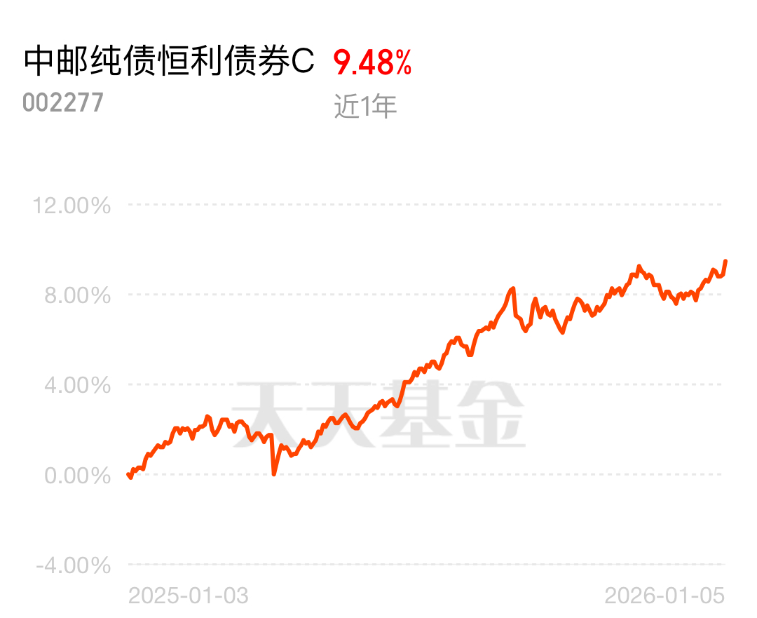 现在定存利率下降的嘎嘎快,还不如配置一个债基长期拿住收蛋呢,$中邮纯债恒利债券C$ 年收益率还有九个点