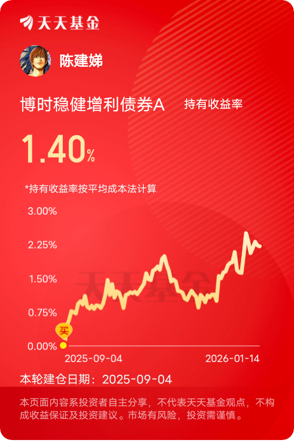 股市还在高点震荡,债市也开始有起色了,固收+的优势尽显无疑。$博时稳健增利债券A$ 债券资产作“压舱石”,股票资产灵活增强,近一年收益率已有8.57%,持续赚钱能力很在线。这基精准踩中了2026开年债市的核心风口,套息策略。华西证券1月债市周报明确说,当前资金面平稳,隔夜利率DR001、R001基本围绕1.3%、1.4%的舒适区间震荡,这种环境下套息策略相对占优。这基本身就侧重中短期债券配置,刚好契合这种市场环境,能稳稳吃住票息收益。更关键的是,国盛证券预测1月下旬之后债市修复会更顺畅,10年国债有望在上半年创新低,对这基来说是持续利好,后续收益有了坚实保障。而且它的权益仓还藏着惊喜!布局了铜陵有色,这只股最近表现亮眼,1月以来涨势如虹,单日涨幅一度达到7%以上。最近全球经济复苏预期升温,工业金属需求持续回暖,铜陵有色作为铜加工龙头企业,完全受益于这波行情。而且铜作为新能源汽车、新型电力系统的核心原材料,随着绿色转型战略推进,长期需求缺口明显,后续上涨动力十足!#17连阳!A股日成交达3.6万亿元创历史新高# #晒收益#