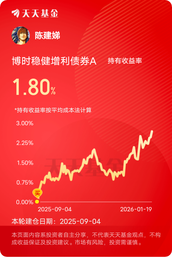 不得不说,$博时稳健增利债券A$ 最近挺给力啊!债券部分稳稳收息,权益部分在4100点的市场里灵活操作。昨天狂揽22个蛋,近一年收益率稳稳站在了9%上,业绩领先同类。2026年债券市场“固本拓新”的大趋势和城投债的结构性机会对这基来说是大利好,根据1月16号债券市场年度论坛的研判,2026年债市或会延续震荡态势,但短端票息策略和“固收+”策略会更稳妥,而且城投债在供给收缩、需求稳定的格局下,仍是风险可控的重要资产类别。这基的投资策略里,本来就重点配置城投债和高等级信用债,基金经理提前布局了这类优质资产,最近随着市场情绪回暖,这些债券的价格持续上涨,直接带动了这基净值的飙升。而且它的权益仓位最近也表现得特别出色,精准踩中了当下的转债和半导体板块热点。最近转债市场特别火爆,尤其是那些业绩向好、转股溢价率合理的标的,1月18号不少转债涨幅都在3%以上,这基配置了不少优质转债,既享受了债券的固定收益,又吃到了转债上涨的红利。除此之外,它的权益仓位还布局了半导体产业链的优质个股,昨天半导体板块逆势上涨,这波行情稳稳吃到了。#国家电网拟投资4万亿元建设新型电力系统# #晒收益#