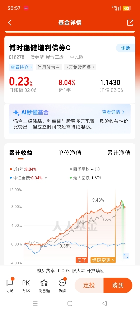 最近市场风格切换快,大盘震荡,配置点低波动的固收+产品确实能让人更安心。$博时稳健增利债券A$债券提供基础收益,股票增强长期潜力,近一年年化收益8.2%+,表现稳健,是资产组合里不错的压舱石。最近债市利好消息不少,央行买断式逆回购投放加量,流动性足足的。加上摊余债基密集开放,给债市带来了大量配置资金,据华西证券分析,2月摊余债基开放规模预计594亿元,其中4只产品在2月首周就开放了310亿元,这些摊余债基大多会配置5年期左右的信用债和利率债,这基的核心配置就是这类品种,需求增加,收益稳定性和上涨空间也跟着提升。而且年初本来就是机构布局高票息资产的重要窗口,各大机构抢筹信用债和中短端利率债,需求端的支撑特别强劲。再看它的权益仓更是惊喜满满,持仓的国泰海通益于经纪、投行板块回暖,加上机构资金持续布局金融龙头,短期有估值修复可期。再加上万华化学的近期受益于化工产品价格回暖,尤其是核心产品MDI量价齐升,带来业绩增量,最近表现强势。长期来看,它正从周期股向周期成长股转型,新材料产能持续释放,加上石化业务降本增效,未来几年业绩增长确定性很强。#2月基金投资策略#