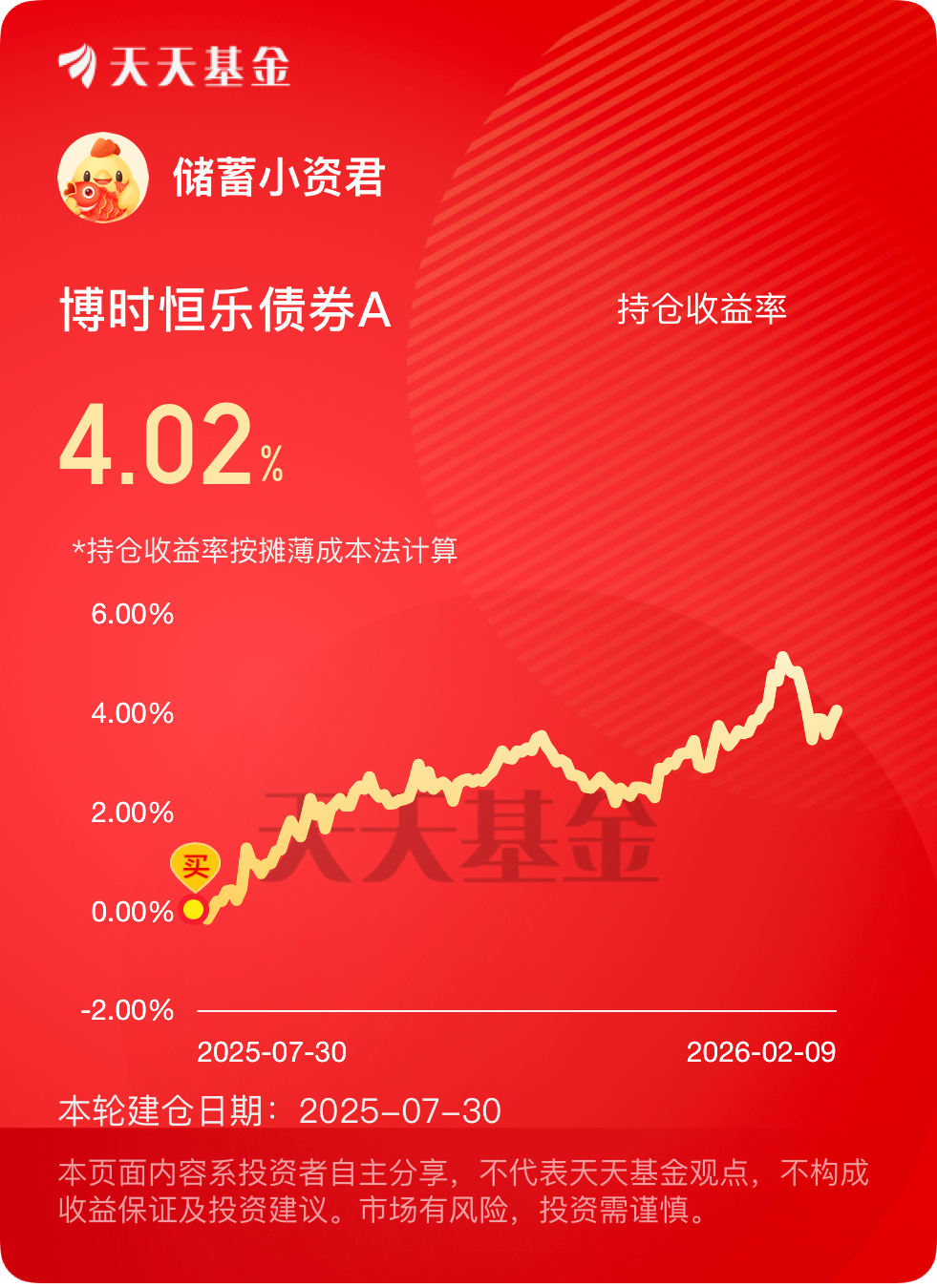 必须给$博时恒乐债券A$ 点个赞!市场给机会,它是真能接住,昨天股债两边都把握住了机会,昨天直接赚了20个蛋,近一年收益已有8.12%,不管是短期还是长期看,表现都挺让人放心的。最近最给力的就是债基资金回流,加上国库现金定存的补充,债市回暖迹象明显!前段时间固收+基金出现了小幅赎回风波,但仅仅持续了1个交易日,从2月5日开始,中长债基、短债基金就连续获得可观申购,资金纷纷回流债市,推动债价上涨,这基精准吃到了这波红利。而且它的权益部分精准踩中了最近的周期板块风口,权益部分有万华化学、藏格矿业、盐湖股份等化工和有色龙头,这些个股最近表现强势。有色板块近期大涨,万华化学作为化工龙头,最近也因为下游需求回暖,股价稳步上涨,直接给基金的收益添了一把火。这只基的权益仓位配置非常灵活,不贪多、不追高,专选那些业绩稳定、估值较低的周期龙头股。比如万华化学,作为全球化工巨头,业绩稳定,估值合理,就算化工板块有波动,也能稳稳扛住;藏格矿业、盐湖股份,都是国内锂资源龙头,受益于新能源行业的发展,长期看好,既能跟着周期板块赚短期行情,又能长期持有拿收益。##全球股市集体大反攻 你的仓位配置如何?#