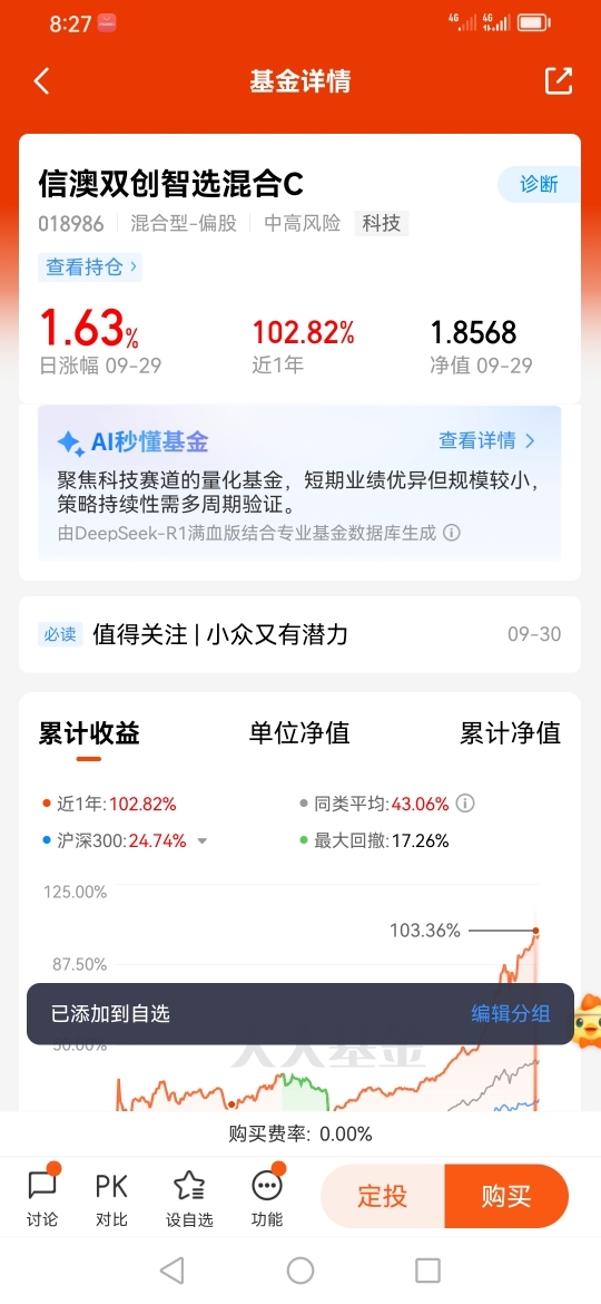 #信澳宝藏基#信澳双创智选混合C(018986)我已加入自选,我是在2025年1月18日买入该基金的,因为当时我认为人工智能行业的发展潜力巨大: