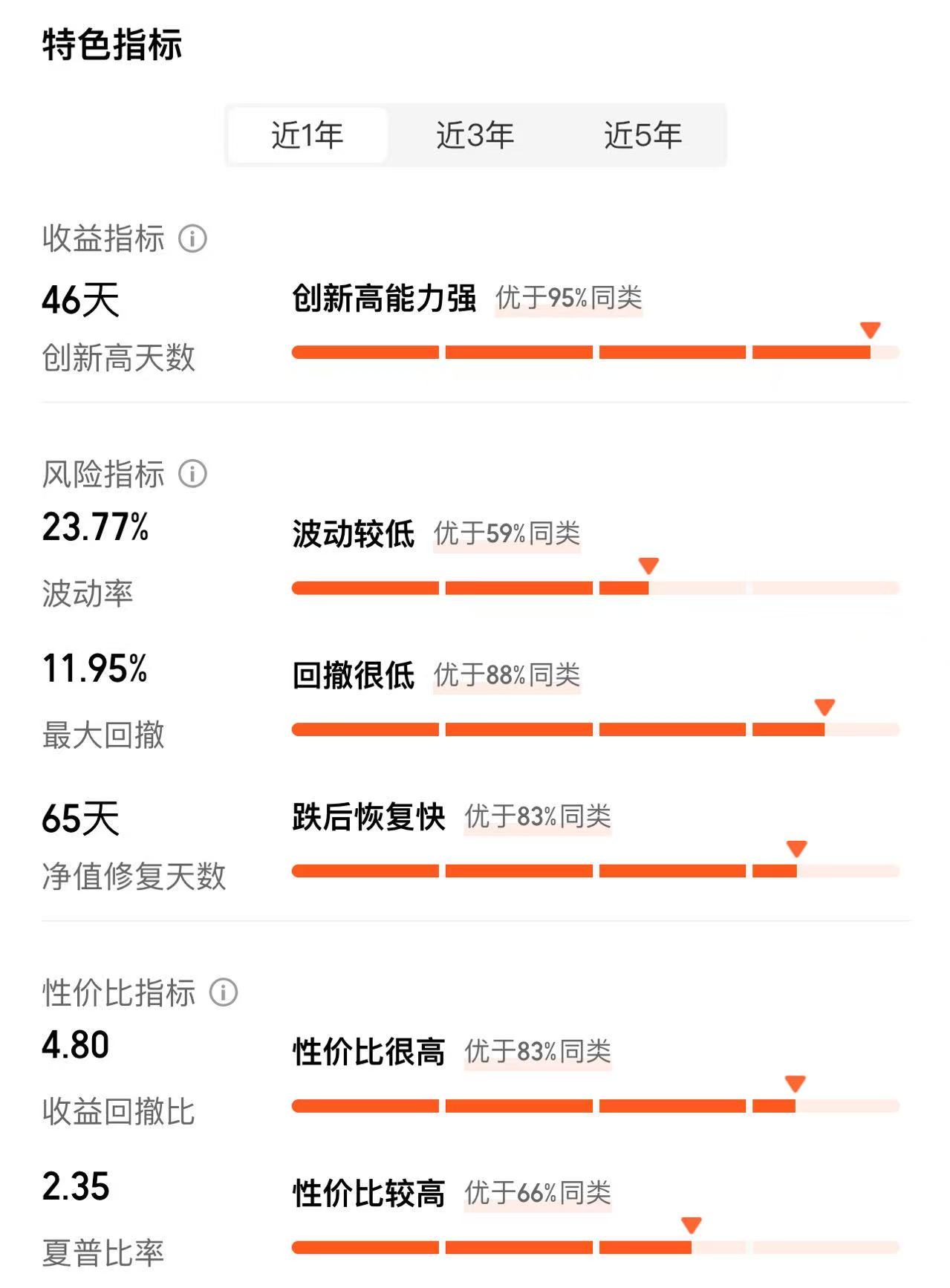 从特色数据上来看,近一年波动率为23.74%,优于59%的同类基金,波动率较低。近一年最大回撤为11.95%,优于87%的同类基金,回撤也很低。夏普比率2.36,优于69%的同类基金,可以说是很高的性价比了。