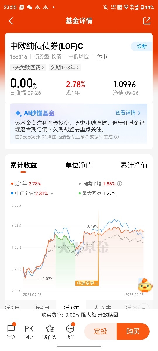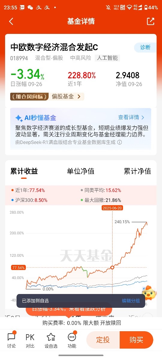 就说跑步吧,它像极了投资里的“长期主义坚守”。我跑步从不会一上来就猛冲,而是先慢走热身,再逐步提速,最后留一段距离平稳收尾——这和投资时的“建仓节奏”如出一辙。当初入手中欧数字经济混合发起A,正是看中它聚焦数字经济这条长期赛道,但我没有一次性满仓,而是分3次定投入场,既避免了短期市场波动带来的冲击,也像跑步热身一样,让资金“逐步适应”市场节奏。而且跑步最忌“中途放弃”,哪怕遇到刮风下雨,我也会换成室内跑步机坚持;投资也一样,去年数字经济板块经历过一波回调,身边有人慌着赎回,但我想起跑步时“熬过长距离疲劳期就能突破”的体验,选择继续持有,后来板块回暖,基金净值也慢慢回升,这便是“长期策略”的力量。