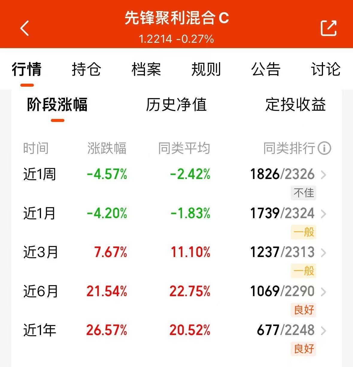 别看今天估值只涨1.61%,先锋聚利混合A近六个月21.69%才是重点,拿得住的
