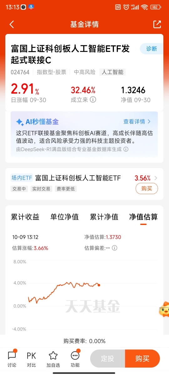 人工智能持续火热,今天富国科创人工智能继续起飞了,目前估值3.66%,与优秀企业共成长$富国上证科创板芯片ETF发起式联接C$