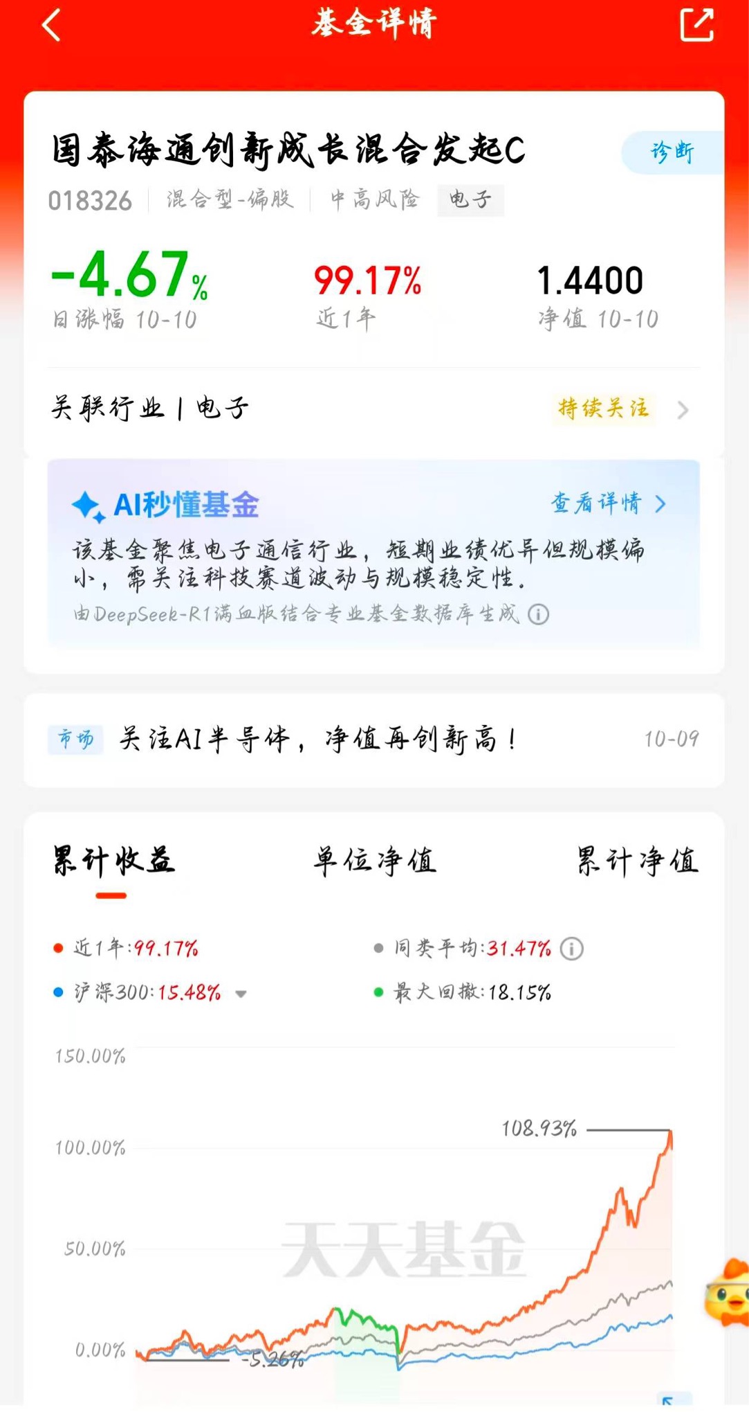 市场今天整体都不太行,但我手里的半导体基金还挺坚挺。果然没选错,近一年106%的