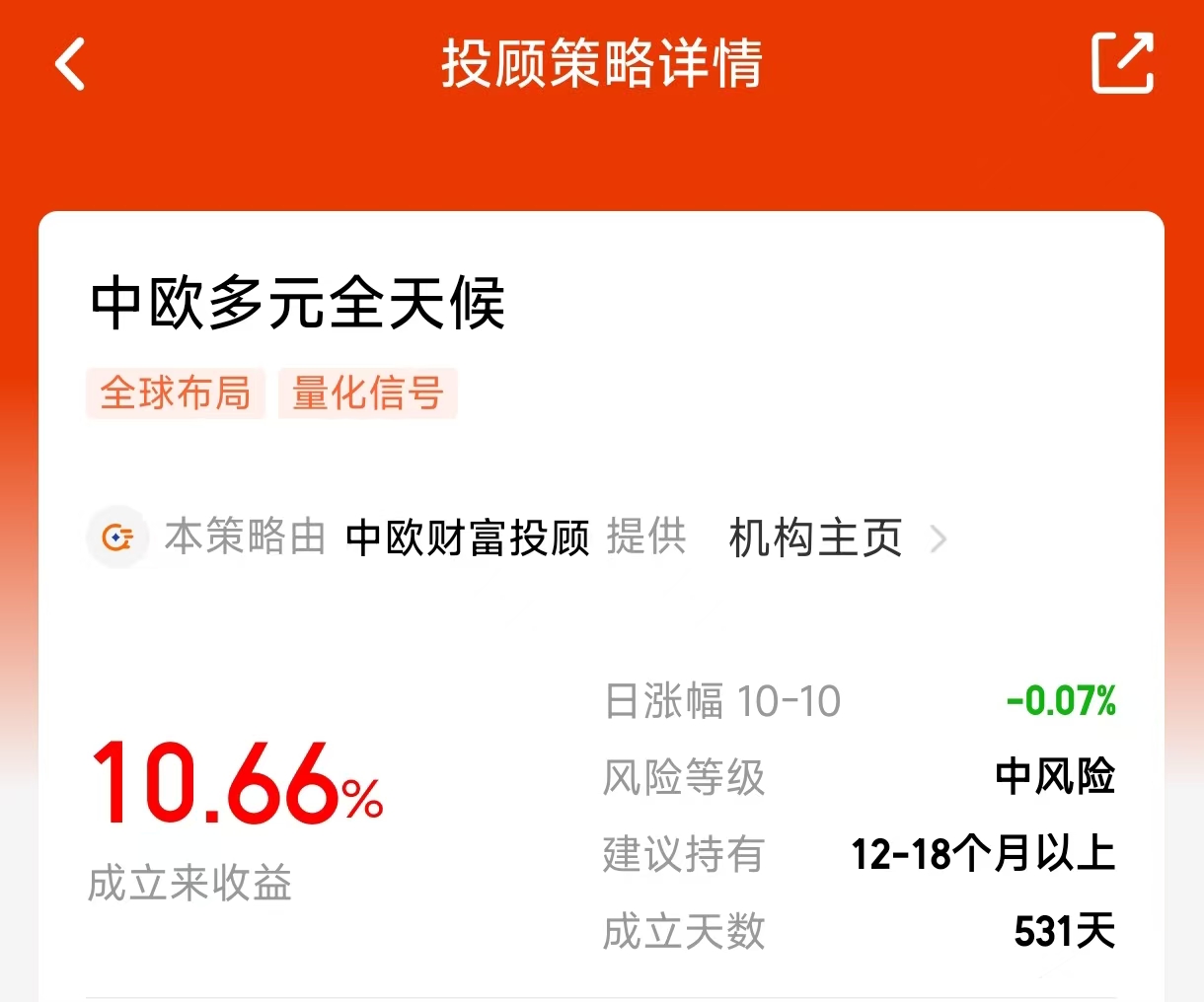 今天市场调整,我的持仓里个别品种波动不小,但整体账户还算平稳。这让我再次体会到分散配置的价值。就像我关注的中欧多元全天候这个组合,它不像单一资产那样大起大落,而是把资金分散到全球不同的市场和不同类型的资产上。这样即便某个市场表现不佳,其他部分的稳健表现也能起到对冲作用。看它近一年的数据,涨幅有9.21%,但最大回撤只有2.02%,波动率也控制在2.64%左右。这种追求平稳增长的方式,或许更适合希望资产稳健增值的人。#券商把脉:冲击小于4月 黄金坑再现?#