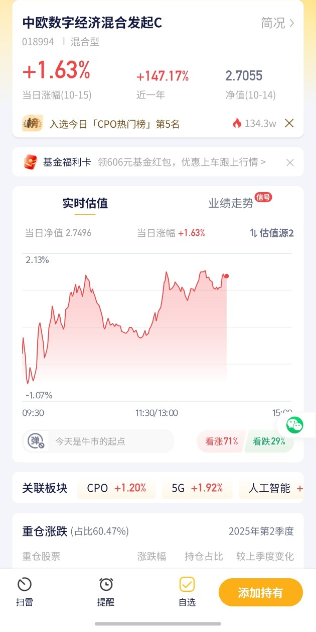 【中欧数字经济混合发起C估值播报+10.15行情】今日预估涨幅+1.63%!