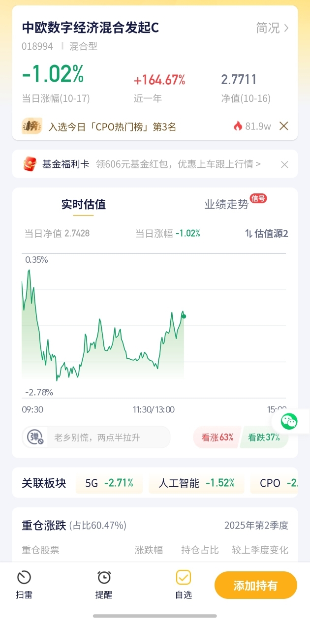 【中欧数字经济混合发起C估值播报+10.17行情】中欧数字经济混合发起C今日估算涨幅-1.02%!收益提前看+数字经济板块今日走弱, 今日A股行情不太给力,新能源汽车、集成电路这些板块跌得让人心慌,也就个别债券基金能看,投资者得多留意市场变化。