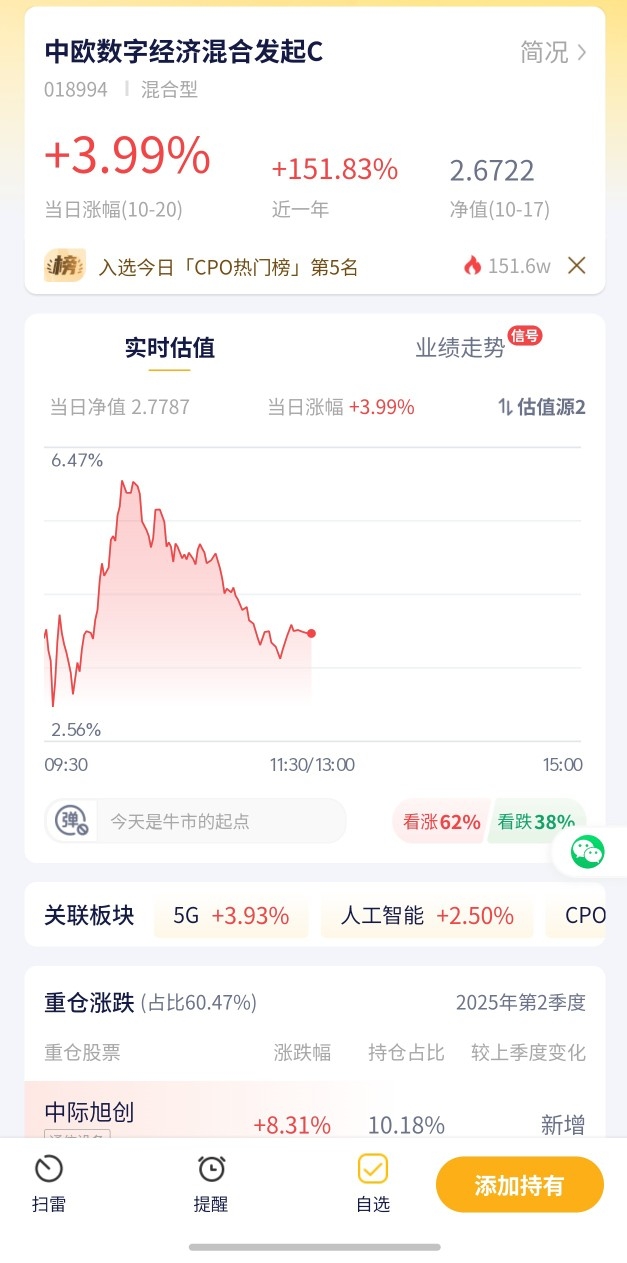 【中欧数字经济混合发起C估值播报+10.20行情】中欧数字经济混合发起C今日估算涨幅+3.99%!收益提前看,数字经济板块今日表现亮眼~- 今日A股科技、新能源等板块发力,不少基金估值飘红,赚钱效应还可以~