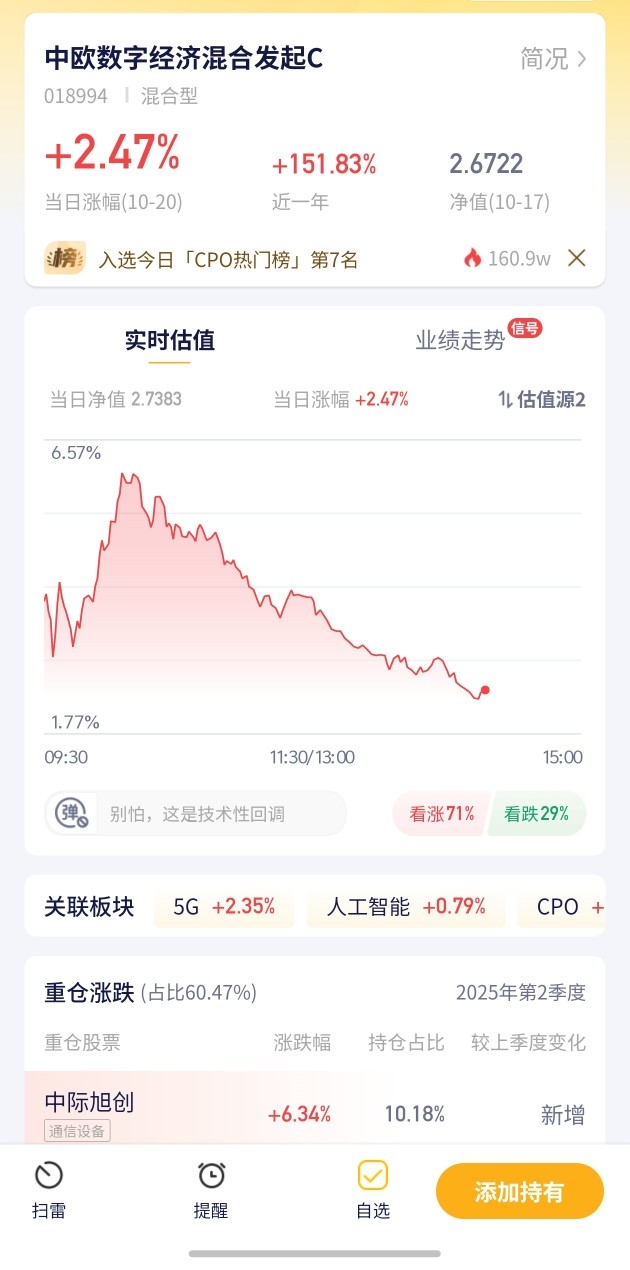 1. 【中欧数字经济混合发起C估值播报+10月20日行情】中欧数字经济混合发起C估涨+2.47%!数字经济板块今日发力,想知道后续能否延续涨势?速看行情~