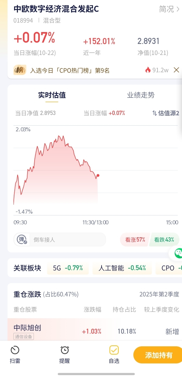 【中欧数字经济混合发起C基金估值播报+10.22行情】