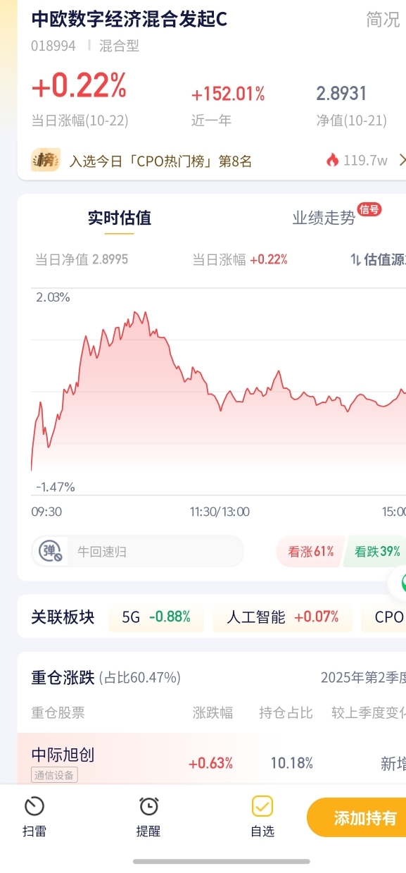 中欧数字经济混合发起C今日预估涨+0.22%!收益提前看+当日市场分析,速看持仓今日A股分化,质量成长、数字经济基金小涨,新能源、港股创新药基金跌得多,市场投资者情绪比较谨慎。~