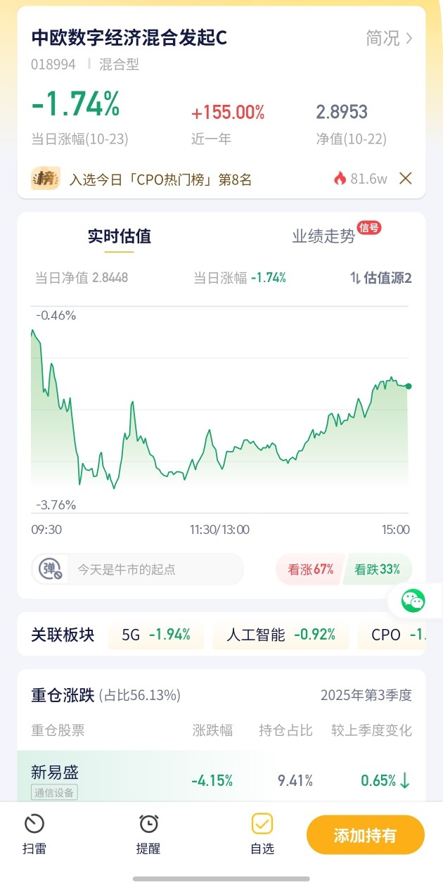 【中欧数字经济混合发起C估值播报+10.23行情】