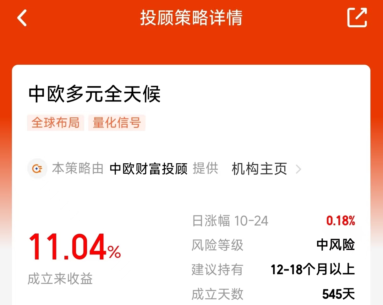 最近市场波动加大,我的账户却比较平稳。这要归功于我之前配置的中欧多元全天候投顾组合。它不像单一资产那样大起大落,而是把资金分散到全球十多个相关性较低的市场和资产类别中。这种思路就像“不把鸡蛋放在同一个篮子里”,即便某个市场表现不佳,其他资产的收益也能起到对冲作用。查看这个组合的数据,近一年涨幅接近9.18%,最大回撤只有2.02%,波动率也控制在2.7%左右。对于希望账户平稳增长的朋友,这种分散配置的方式确实能让人更安心。#沪指再创十年新高!接下来你会如何操作?#