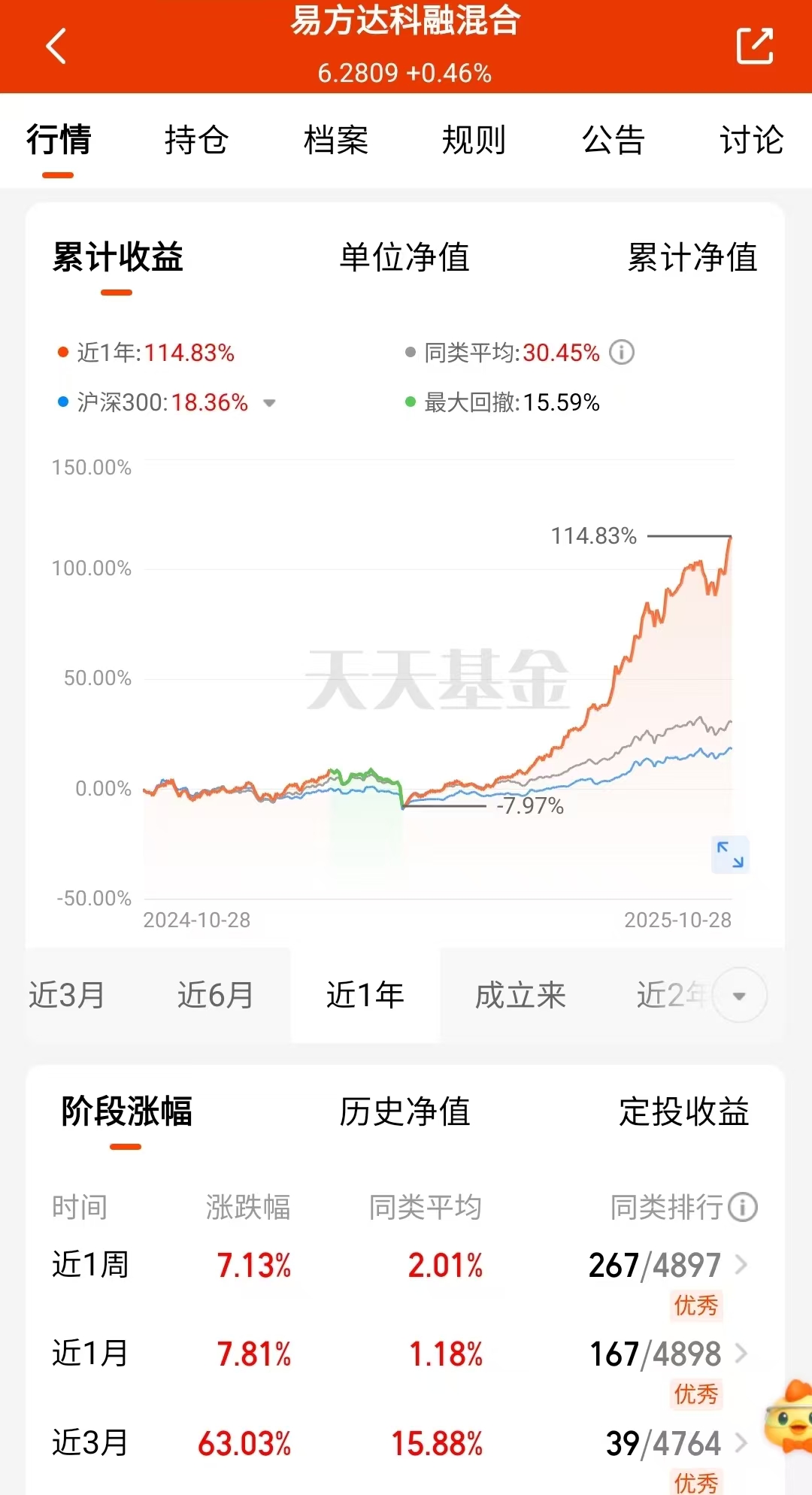 这两天上涨,沪指涨超了4000点,热门赛道涨幅大,成长行情轮动快,追起来还是有点困难,我发现易方达科融回话是深度参与科技、新能源、军工轮动配置,而且从长周期来看3年、5年下夏普比率持续优秀,且严控回撤,是成长里的均衡之选呢。比较适合当前想跟上科技牛市,但不想波动较大的我。