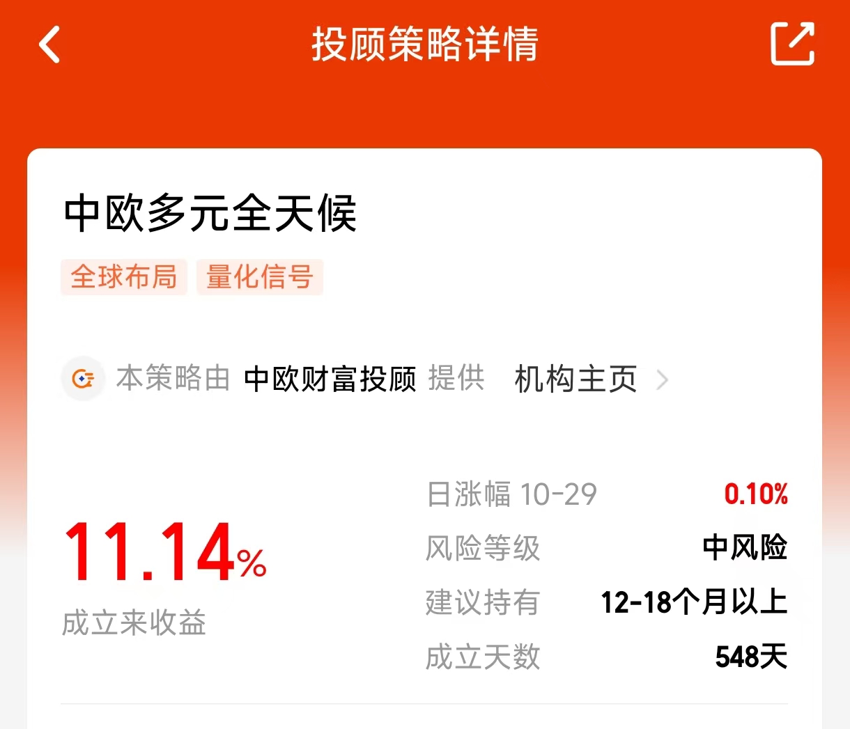 最近市场又站上4000点了,虽然看起来热闹,但心里总有点不踏实。估值这么高,万一调整起来,传统的股债混合产品可能压力不小。我之前也纠结怎么放资金,后来注意到了中欧多元全天候这个投顾组合。它的思路和桥水的全天候策略一脉相承,但更贴合本土市场,而且不限购,用起来挺灵活。最让我安心的是它的全球配置,不光有国内的固收打底,还分散到美股、商品等不同市场,利用资产间的负相关性平滑波动。数据上,近一年涨了9.34%,最大回撤才2.02%,波动率控制在2.76%左右,持有体验确实稳。这种策略不赌方向,反而适合当下这种复杂行情。#美联储再次降息!12月降息与否难料#