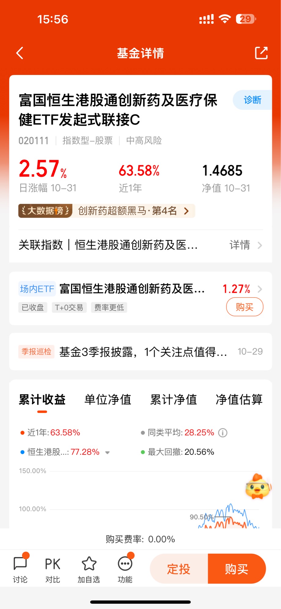 手里有中欧数字经济C,也配了点富国恒生港股通创新药及医疗保健ETF联接C医药、生物科技、医疗器械这些方向最近真能打,近6个月涨了36%,1年更是冲到64%,回本速度也快,跌下去35天就捞回来了!现在估值比过去五年65%的时间都便宜,划算。