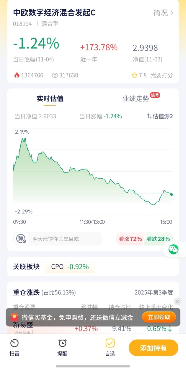 4. 【中欧数字经济混合发起C估值播报+11.04行情】