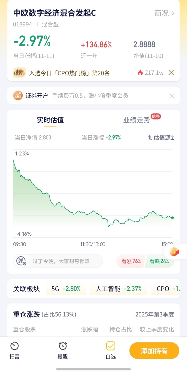 10. 【中欧数字经济混合发起C估值播报+11.11行情】中欧数字经济混合发起C今日预估涨幅-2.97%!数字经济板块短期调整,长期发展逻辑不变。