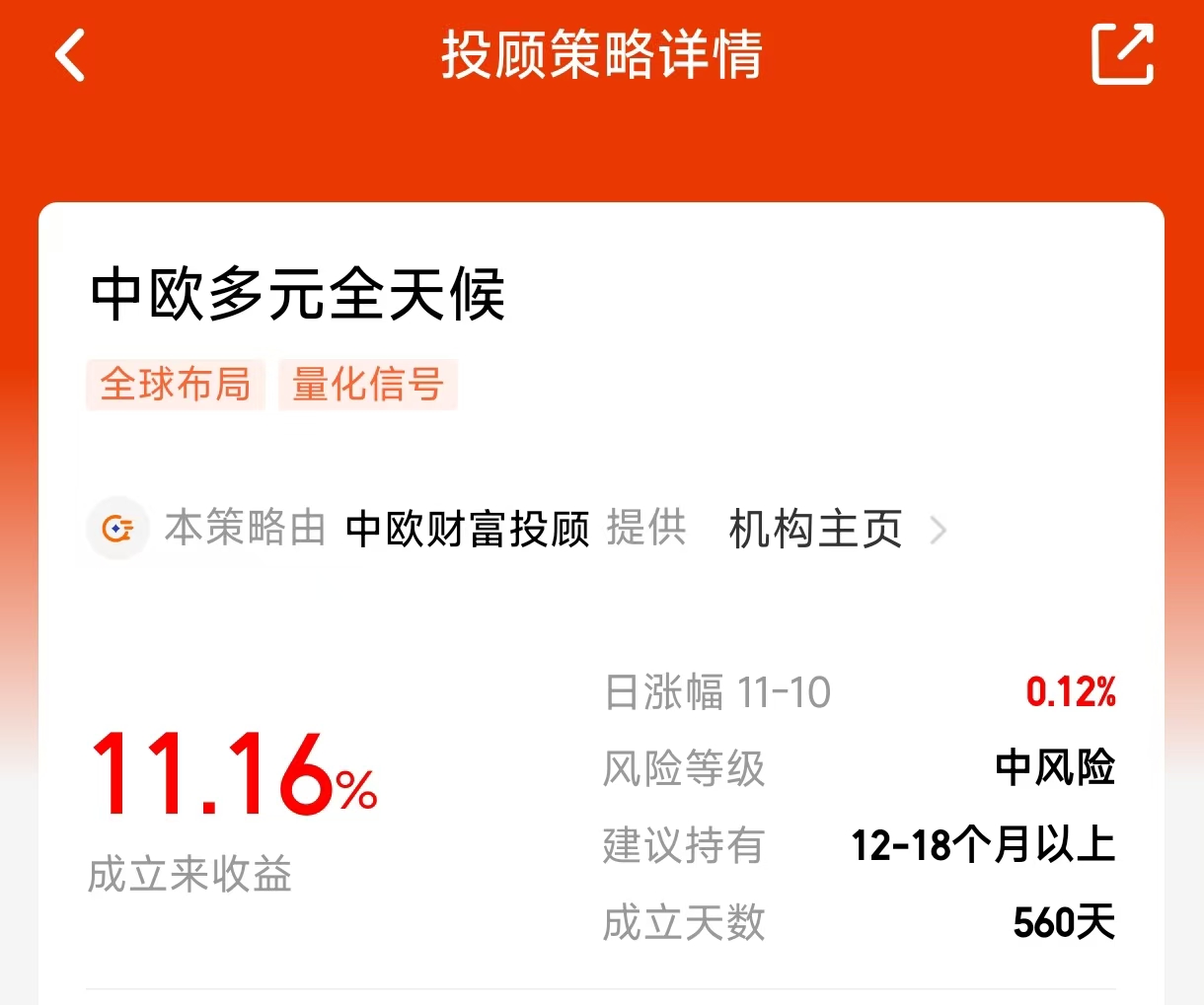 最近打开行情软件,看到A股再次站上4000点,心里真是喜忧参半。喜的是市场热度回来了,忧的是这么高的位置,万一调整起来,那些重仓A股的传统“固收+”组合能扛得住吗?我自己的账户之所以还能保持淡定,很大程度上是因为早早就配置了中欧多元全天候这个投顾组合。它不像普通产品那样只押注国内市场,而是把资产分散到全球的股票、债券和商品中,利用它们之间的负相关性来平滑波动。我记得桥水的全天候策略很有名,而中欧这个可以说是它的“本土化”版本,最关键的是额度比较充足,随时都能买。查看组合最新数据,近一年涨幅有8.62%,但最大回撤仅仅2.02%,波动率也才2.75%,这种稳中有进的感觉确实让人安心。大家在天天基金APP的投顾管家页面,进入“三笔钱投顾”专区就能找到它,操作很方便。#工信部:深入实施“机器人+”应用行动#