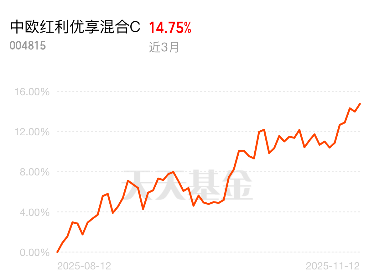 市场波动不小,大家都想求个稳,低估值红利资产成了香饽饽。中欧红利优享灵活配置混合C近3个月涨了14.75%,蓝小康经理选股眼光准,避开分红陷阱,满2万减36加仓,别错过。