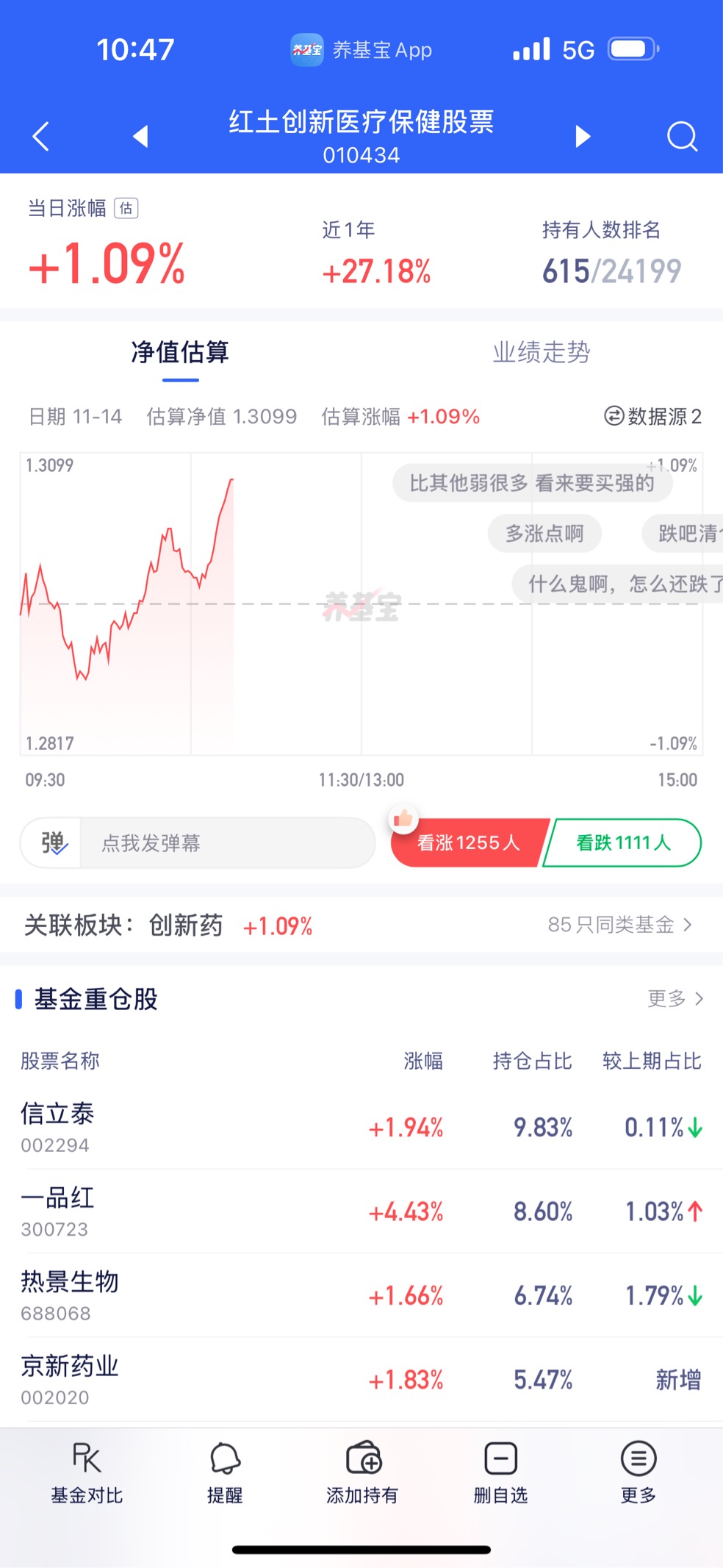 研究了一下"医药热门榜"第三名的红土创新医疗保健股票(010434),发现它还是晨星五星评级产品。今日估值微涨0.57%,这么多人加自选确实有道理,投资逻辑很清晰。