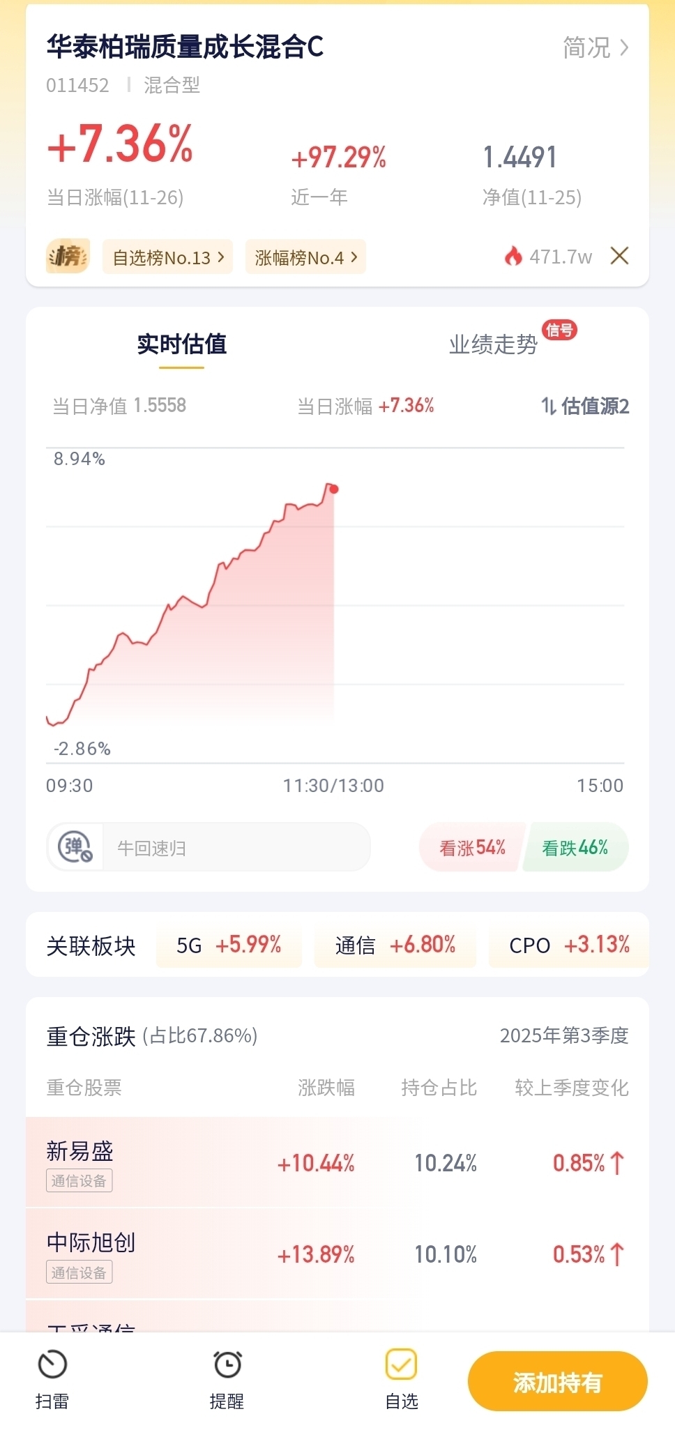 身边好多人都在买CPO相关基金,AI算力需求爆发,这个赛道确实有前景。昨天对比下来,华泰柏瑞比永赢、中航的CPO基金涨幅还高,有点惊喜!它聚焦高质量成长,基金经理对科技趋势把握很准,今天板块继续领涨的话,有望继续领跑~