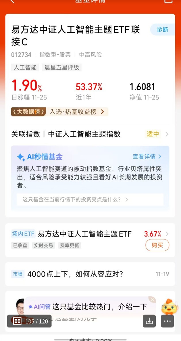 今天人工智能涨得真好呀,AIGC 内容创作、智能驾驶等应用场景商业化提速,用户付费意愿提升,全产业链都在享受行业红利,这波上涨势头强劲,机会难得赶紧抓住别犹豫$易方达中证人工智能主题ETF联接C$