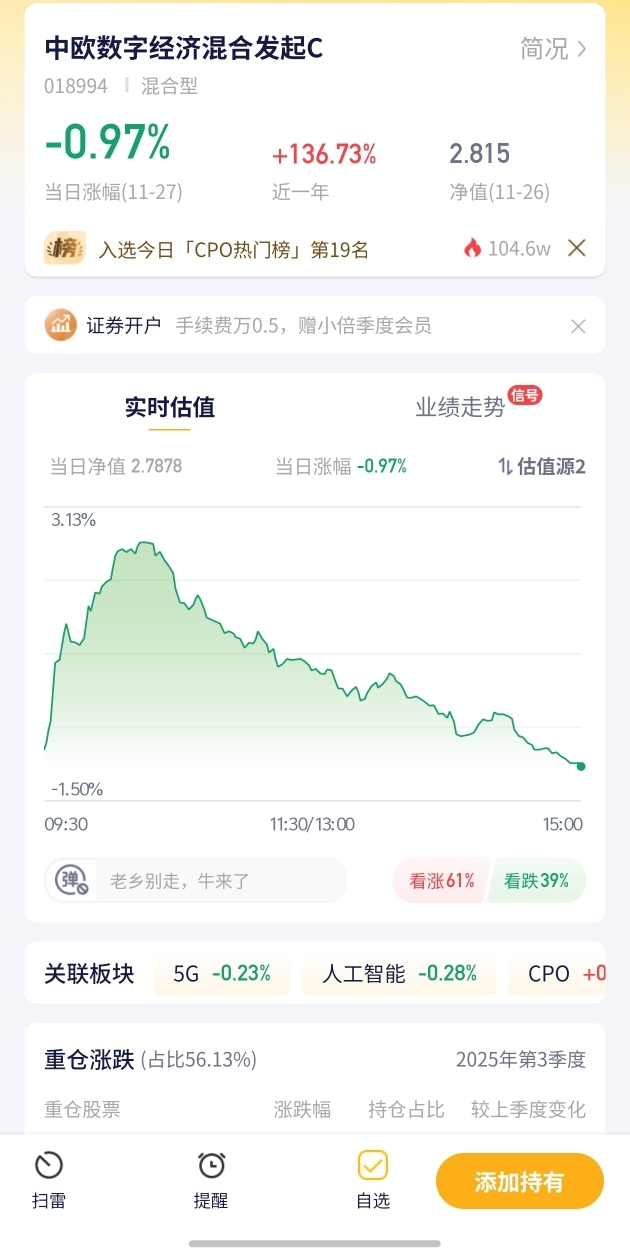 9. 【中欧数字经济混合发起C估值播报+11.27行情】