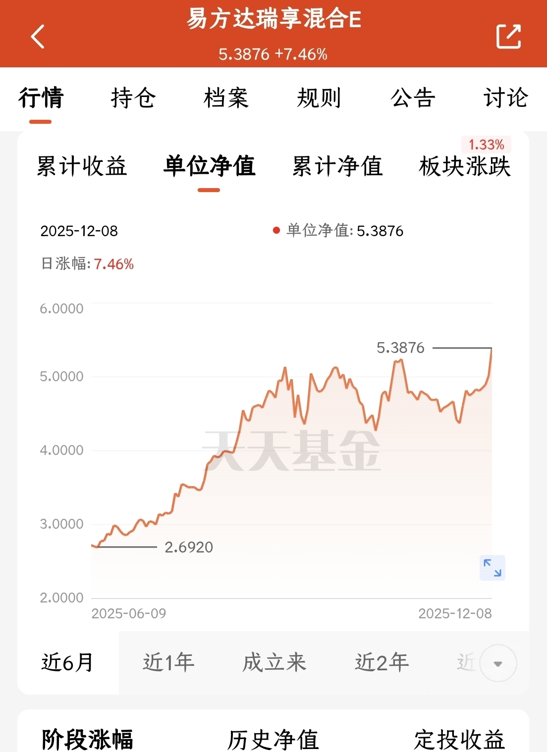 最近股市反弹,行情轮动,CPO上涨趋势重启。$易方达瑞享混合E$ 近期的强势表现确实值得关注。单日净值大涨7.46%,成立以来累计涨幅超400%,展现出基金经理对成长机会的精准把握能力。在科技板块反弹的市场环境中,该产品依托基金经理的全市场配置能力和前瞻性调仓策略,持续展现出较强的爆发力,很不错啊!