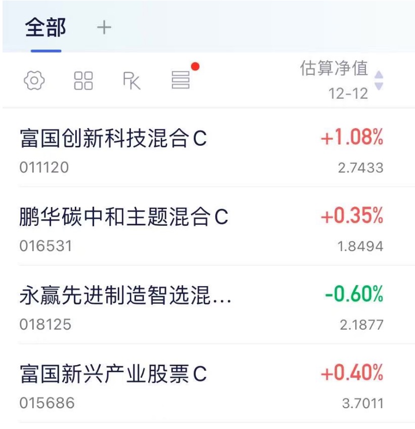 还是科技基确实有实力,市场反弹的时候果然涨得猛,富国创新科技C估值涨1.08%,鹏华碳中和主题混合C估值涨0.35%,富国新兴产业股票C涨0.4%