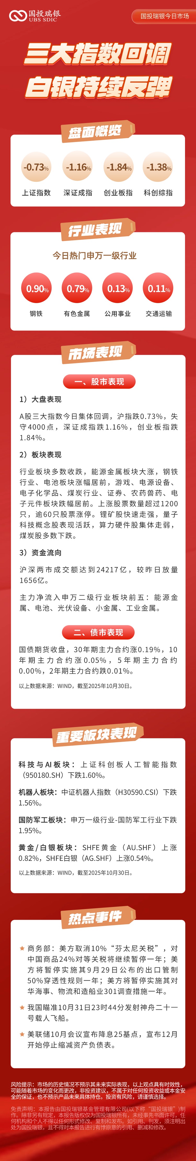 10月30日:三大指数回调,白银持续反弹!