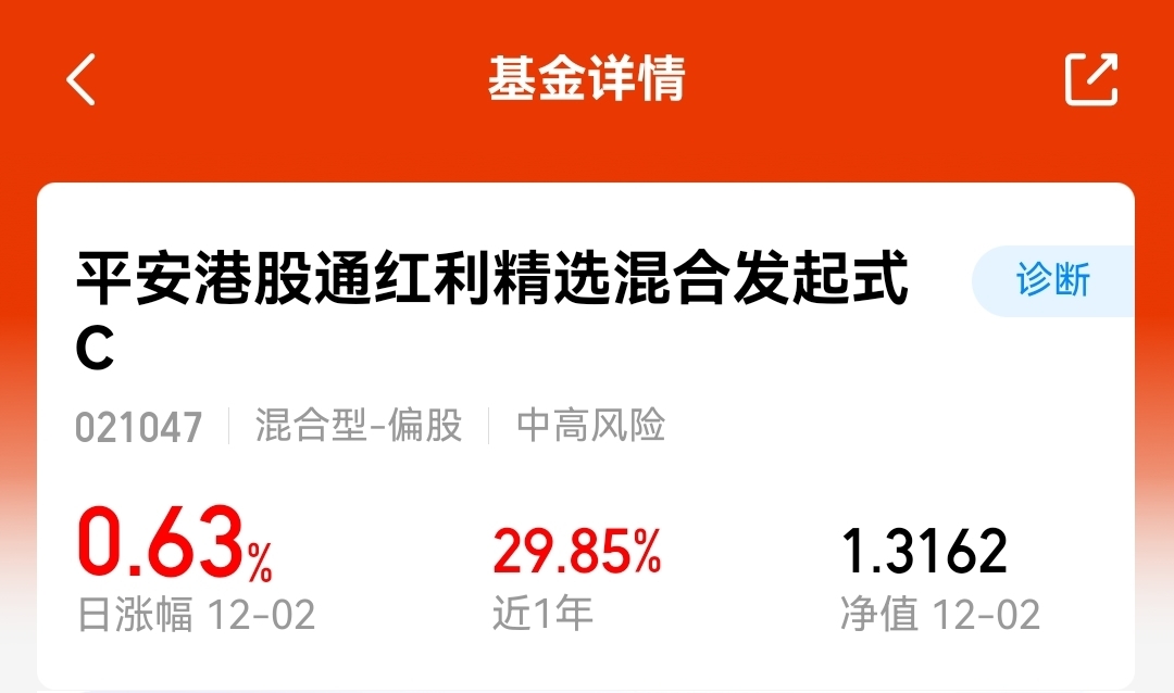 真给力啊$平安港股通红利精选混合C$今晚又涨0.63%,表现稳当!近一年涨29.