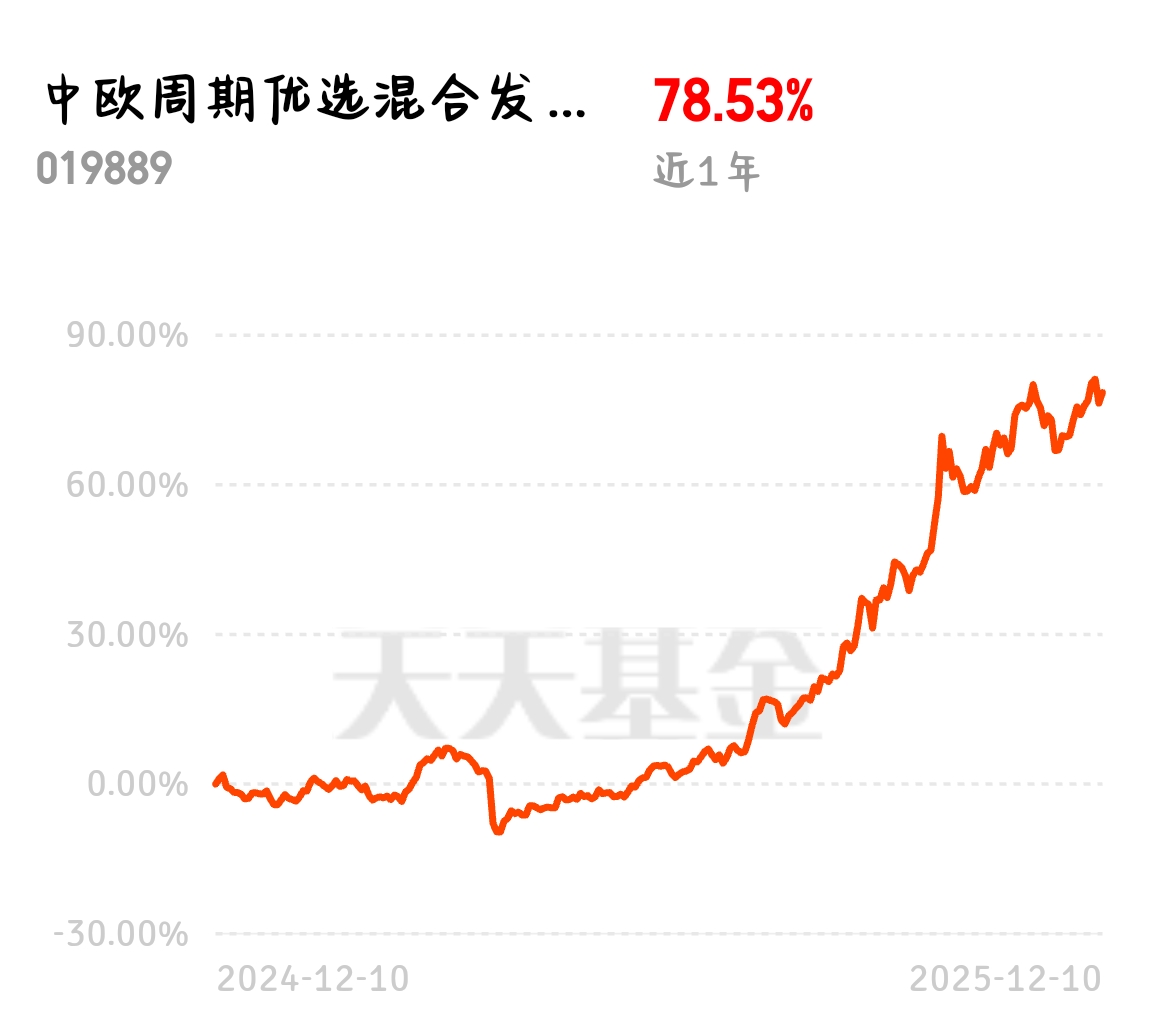 国内 PMI 连续两月扩张,市场情绪企稳调整到位,周期资源板块获资金青睐。中欧周期优选混合发起 C 近 3 个月涨 29.95%,在同类主动基金里表现拔尖,短期配置性价比拉满。$中欧周期优选混合发起C$