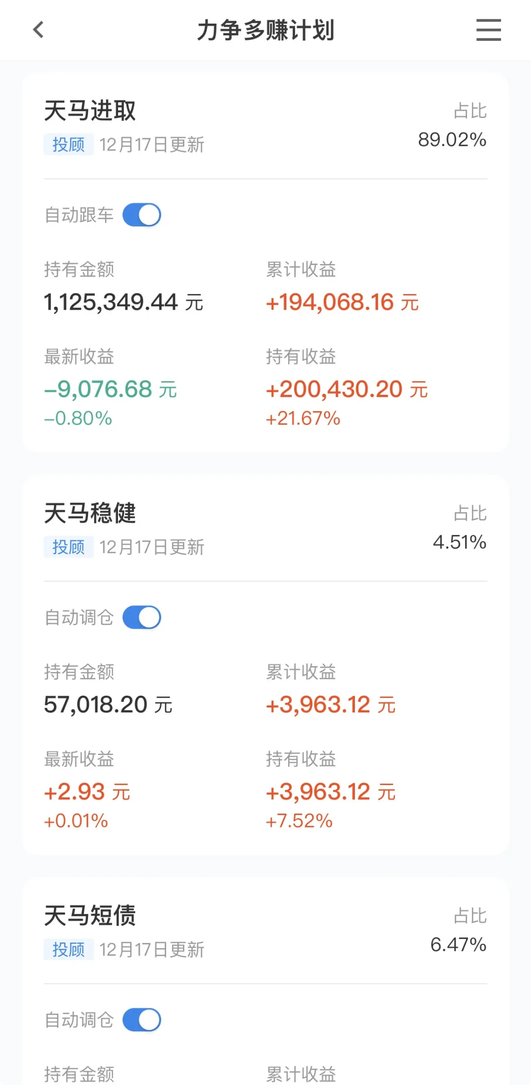 截止昨天(12月17日),我的实盘示范账户中所定投的天马进取组合,盈利约19.4万元,盈利比例约20.8%。