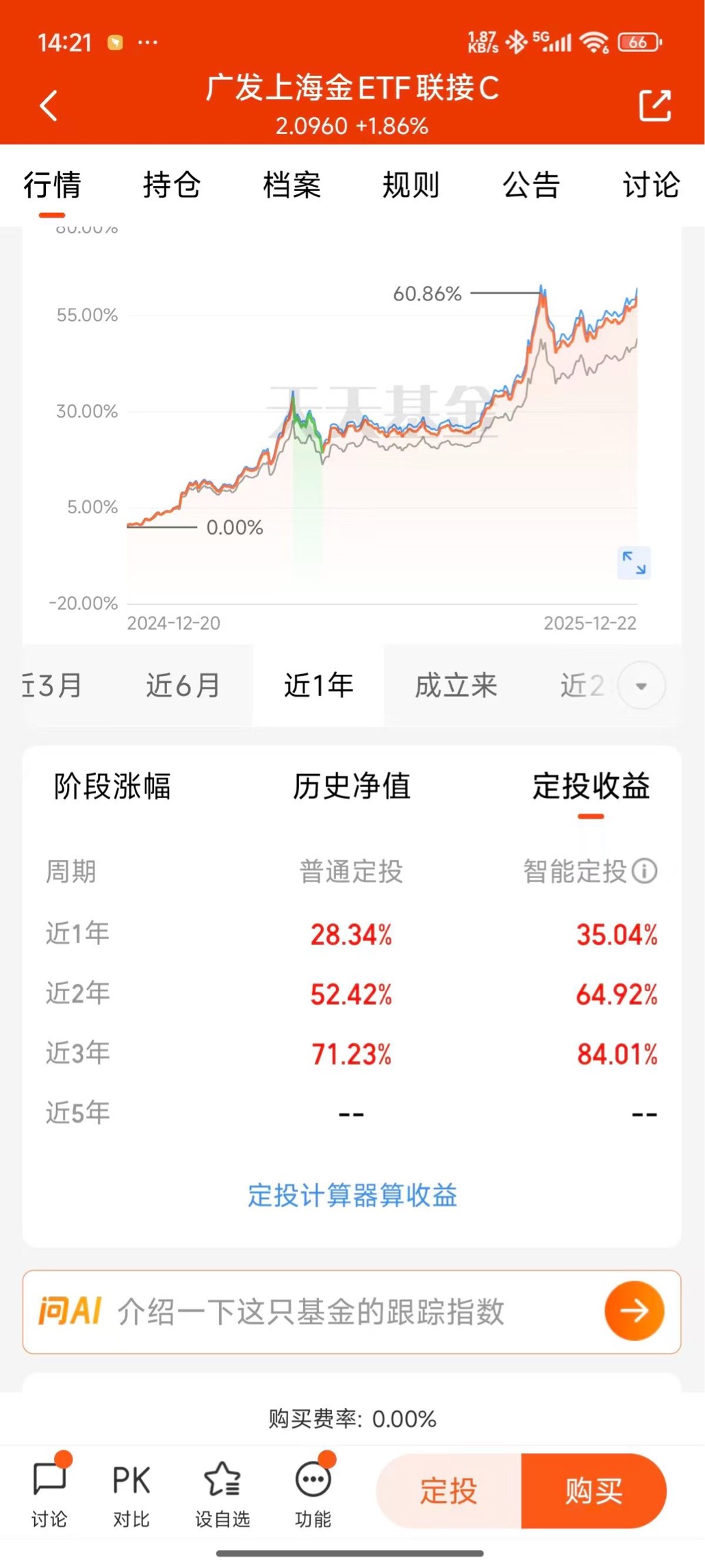 金银比跌到低位,说明白银情绪已过热。溢价超50%意味着短期风险积累较高。相比之下,黄金的货币属性和央行买盘支撑更坚实。我开始定投广发上海金ETF联接C,也吃了50个点的利润$广发上海金ETF联接C$