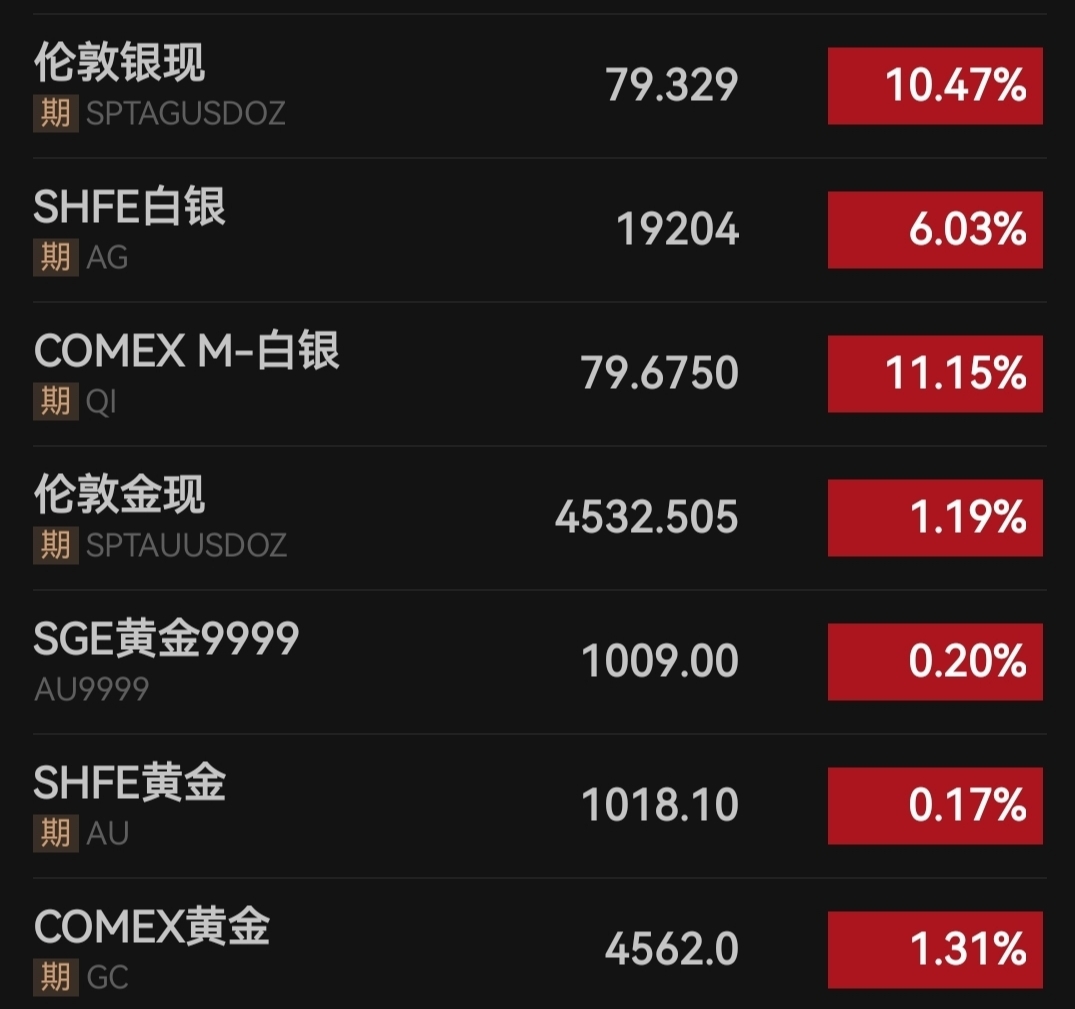 昨夜,贵金属大涨!白银、铂金、钯金涨幅均超10%,再创新高!COMEX白银期货涨11.15%,本周累涨18.06%;现货白银涨10.24%,本周累涨17.87%。重仓有色金属的,恭喜啦!周一数钱要数到手软啦。黄金也创历史新高,COMEX黄金期货涨1.31%,本周累涨3.98%;现货黄金涨1.19%,报4532美元/盎司,本周累涨4.44%。
