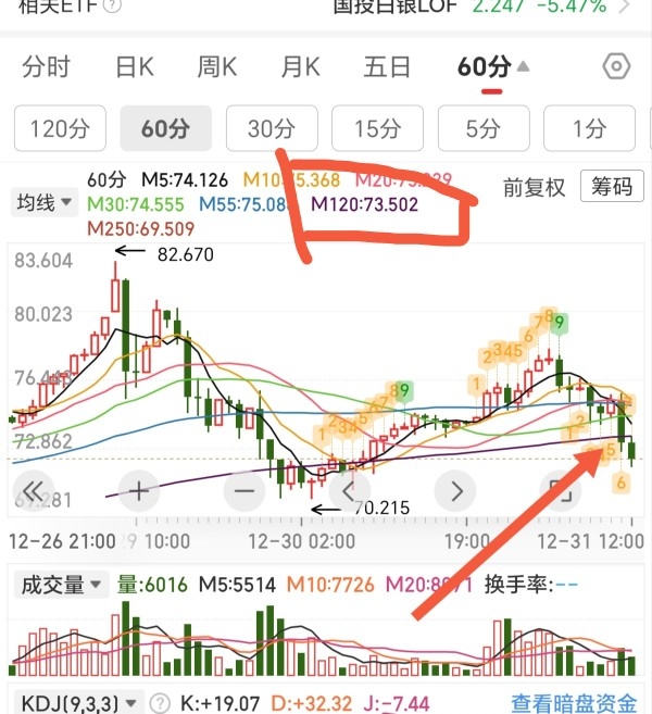 白银要考虑避险了。看下面两幅图 这是今天早上8点截图,当时已经破了小时线的55线,只是收回了。 然后是目前的情况,小时线的120线也破了。走势不好。下午收盘前不拉回来,就大幅度减仓,防止元旦我们这里休市期间还有变数。