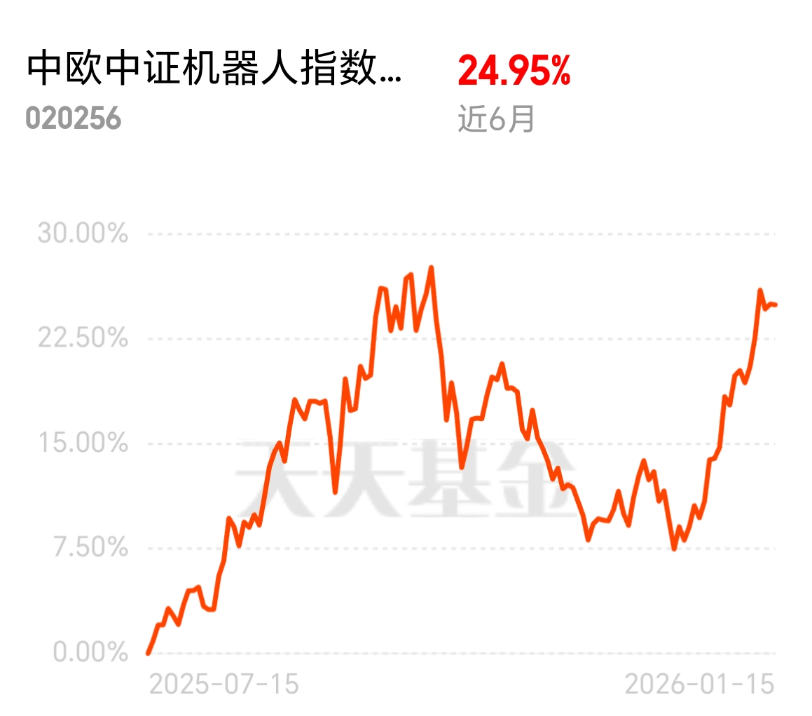 机器人板块成为 2026 热门主线,工业、消费场景全面渗透,热度不断涨。$中欧中证机器人指数发起C$ 近 6 月 24.95%,覆盖核心环节龙头,赛道拥挤度低,上行空间足。