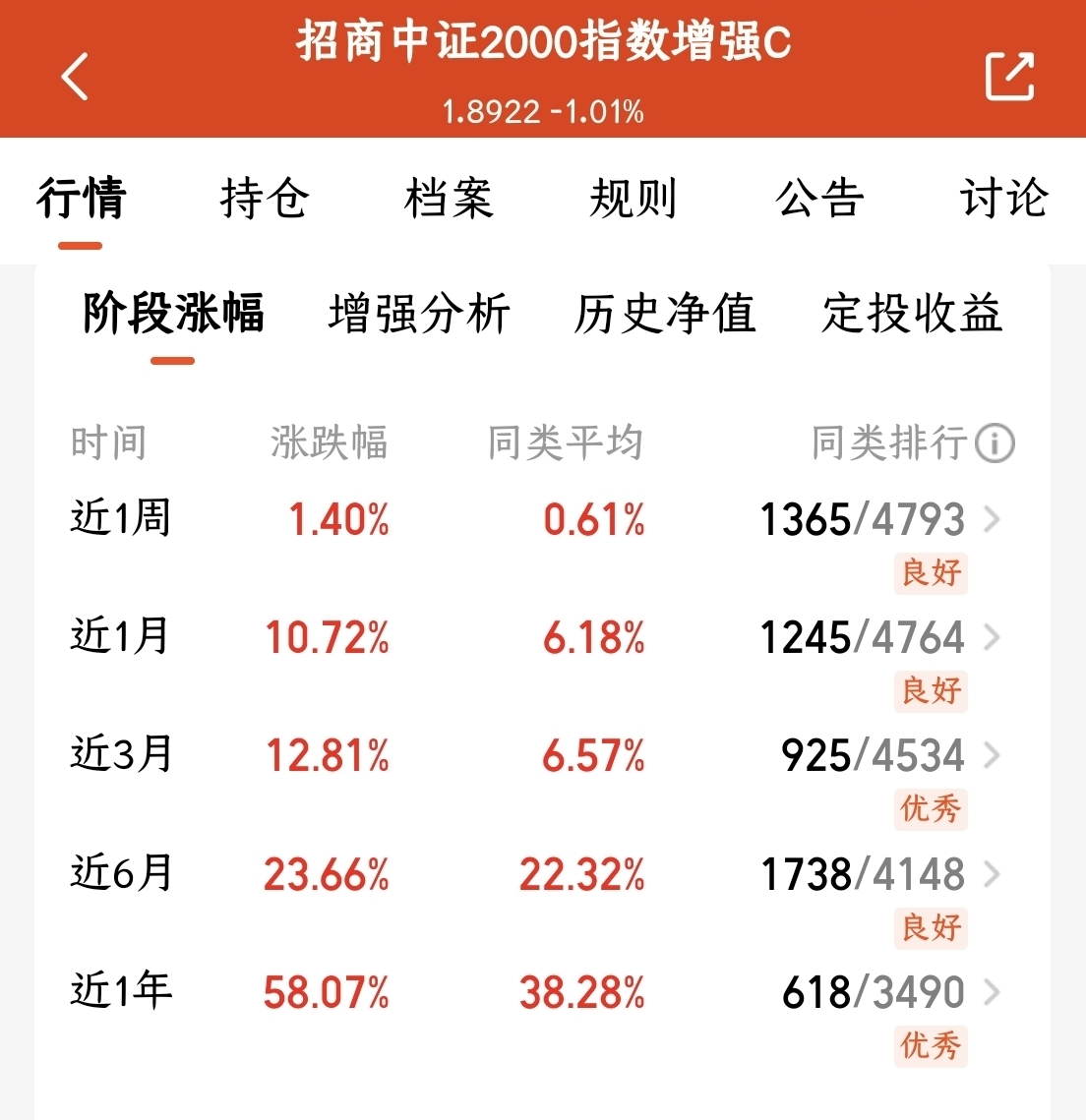 最近大盘震荡回调,牛市的逻辑依然存在。当前市场波动较大时,小盘股往往展现出更强的韧性。历史数据显示,小微盘股票在市场同期表现中通常更为活跃。$招商中证2000指数增强C$ 该基金聚焦微盘股领域,近一年涨幅58.07%,有望在波动行情中捕捉更多机会。