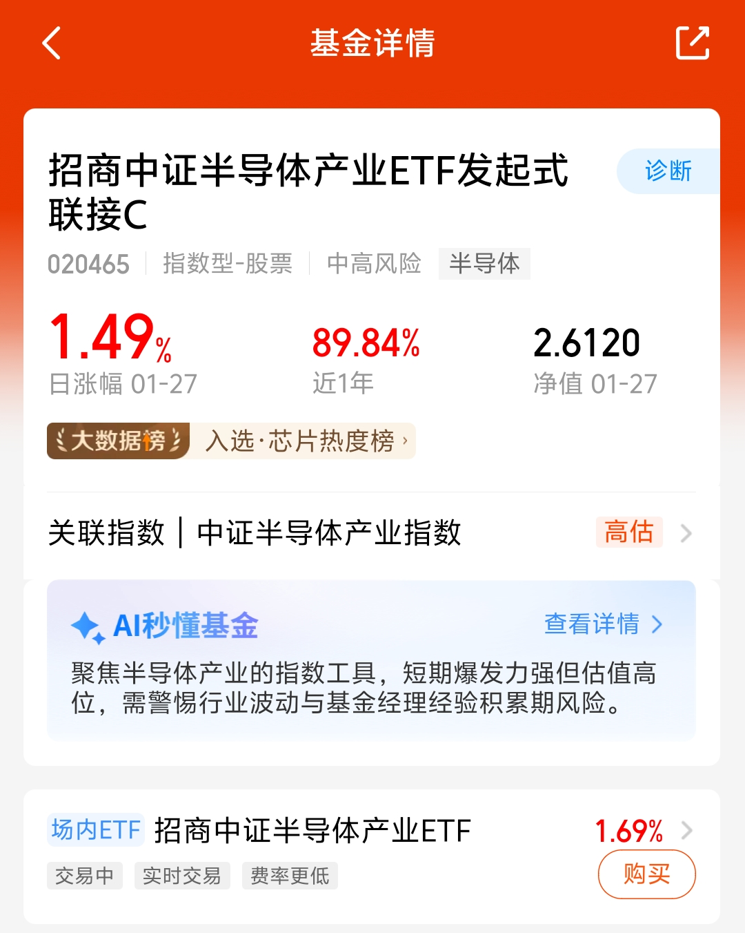 半导体表现还不错呢,今天继续上涨!$招商中证半导体产业ETF发起式联接C$ 昨天涨了1.49%,今天预估涨幅1.69%,近一年涨了89.84%,业绩还不错,看好未来存储和国产替代的逻辑,我准备继续分批布局!