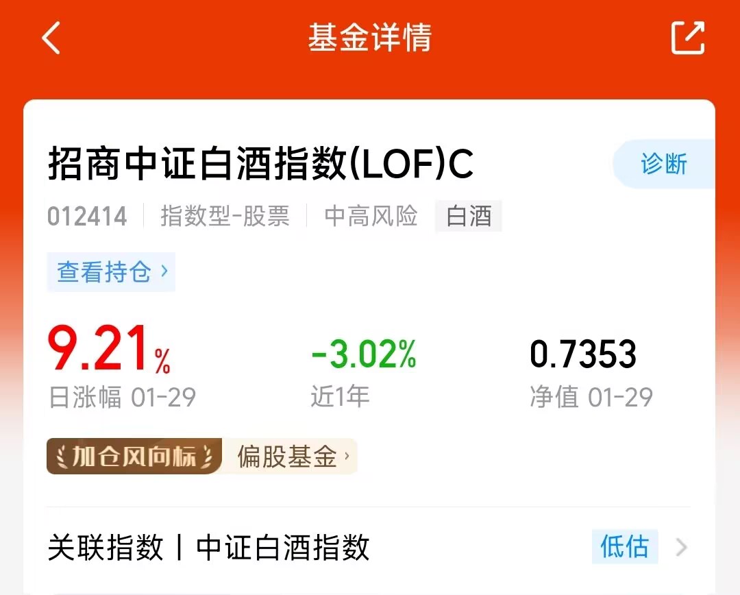 跌了三四年的白酒板块今天突然大涨,拉出底部大阳线。不过当下成交额虽超 3 万亿,却依旧三千多只个股下跌,没带动全面赚钱效应。$招商中证白酒指数(LOF)C(OTCFUND|012414)$ 持仓都是茅台、五粮液等头部酒企,抓板块红利很准,且头部酒企有分红回购、ETF 资金托底,后续有望加速筑底。已开始修复,等低位继续反弹。