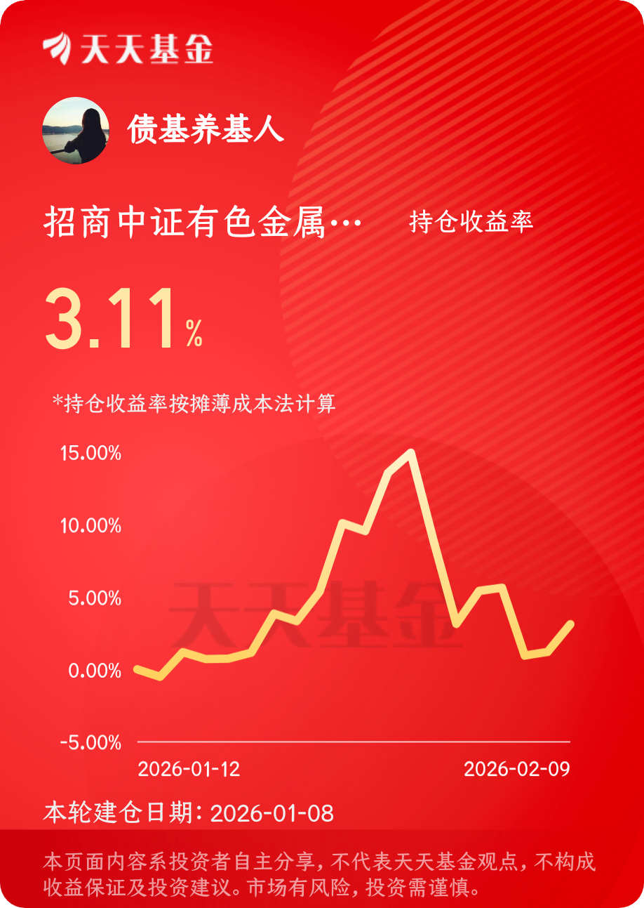 今日股市窄幅震荡,行情分化明显,有色金属板块逆势稳步上行,连续两个交易日获得主力资金净流入,显示其当前具备较强的确定性。地缘局势变化与供需紧张格局持续构成利好,推动板块保持上升动力。我持有的$招商中证有色金属矿业主题ETF发起式联接C$ 目前收益率达到3.11%,基于对行业前景的看好,将继续坚持长期持有策略,期待后续表现。#晒收益#