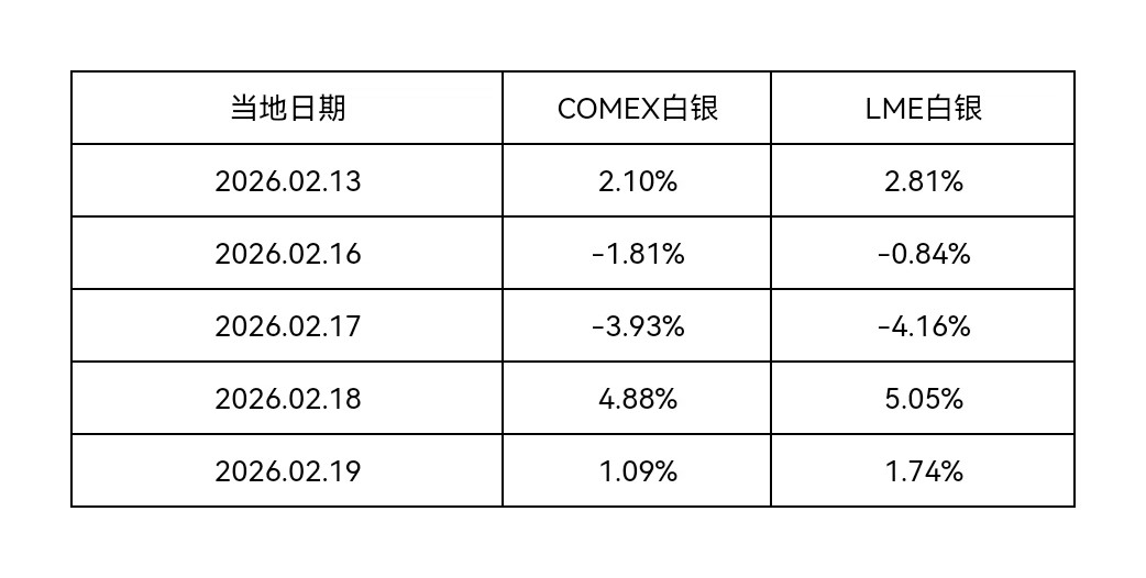 2026年春节期间上海期货交易所休市,海外主要白银交易品种涨跌幅数据如下: