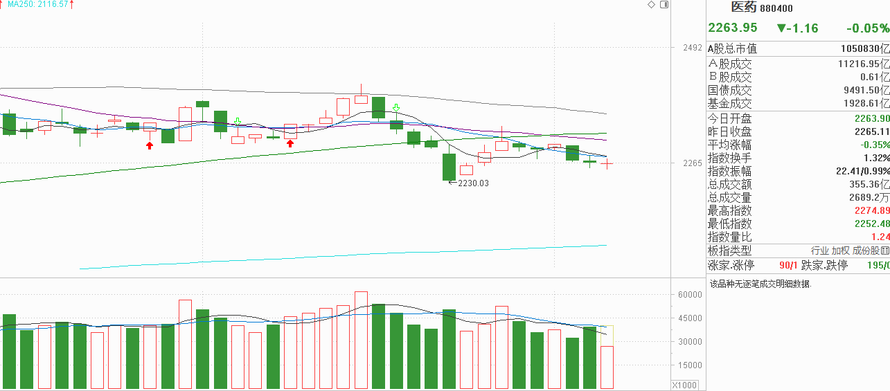 医药昨天窄幅震荡依然收在5天线下方,自11月26号冲高20天线无果回落后基本是阴跌为主,今天也是小阴回落,5天线、10天线依旧是阻力。连续回调6天了并没有再创11月21号的低点,从前期震荡节奏还是近期抛压的减弱的状态看,明后天出现反弹的概率比较大。按理说医药在8月后开始回调,时间周期已长达4个月,这在一般上涨趋势中是很少见的,左侧企稳不易判断,不如换个角度看右侧,主力什么时候参与,我们什么时候跟随并看好。